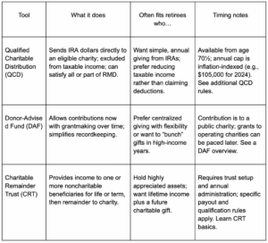 - Use tax-efficient tools like required minimum distributions (RMDs), qualified charitable distributions (QCDs), and donor-advised funds (DAFs).
